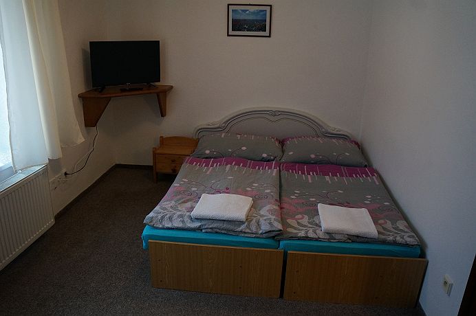 Čtyřlůžkový pokoj č.14. s dětskou postýlkou v prvním poschodí.