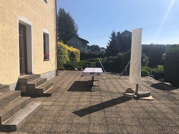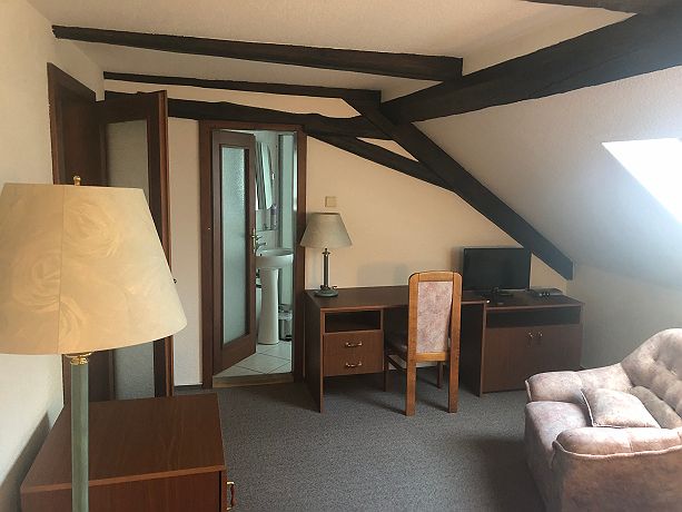 Apartment for 2 people with a double bed. It is situated on the top floor with beautiful view to the garden. There is own bathroom with shower and toilette. There is a desk, fridge, TV with satellite and free WiFi in the apartment. During hot summer days you may use portable Air-Condition. There is common living room available on the ground floor with sitting, small kitchen and a terrace with a grill. You can use a coffee machine, minibar with offer of beverages (for additional fee) and additional kitchen equipment (kettle, cutlery, plates, glasses). You may play billiard and darts during your relax time.