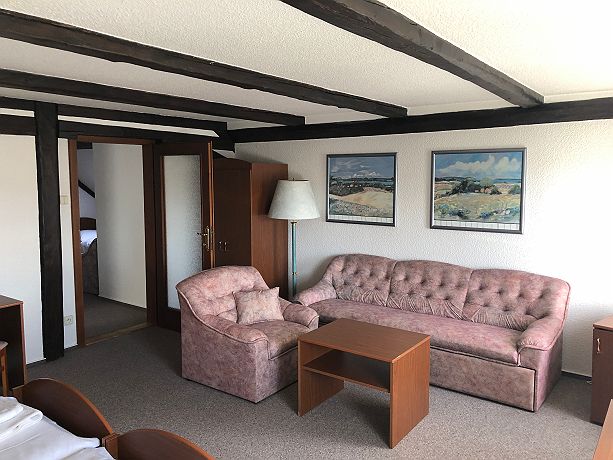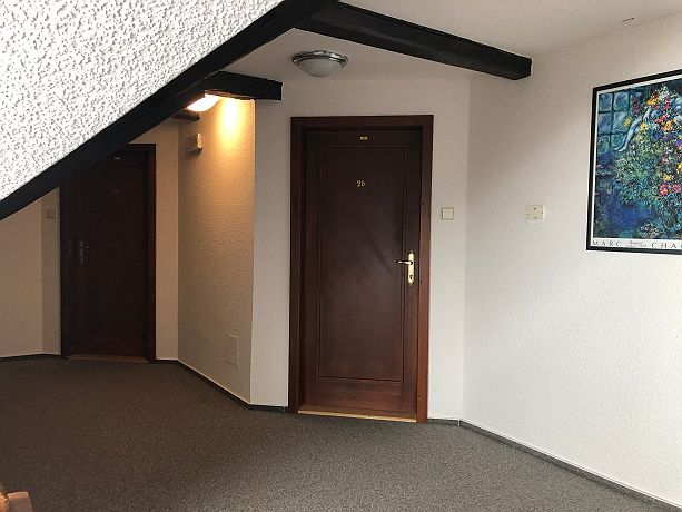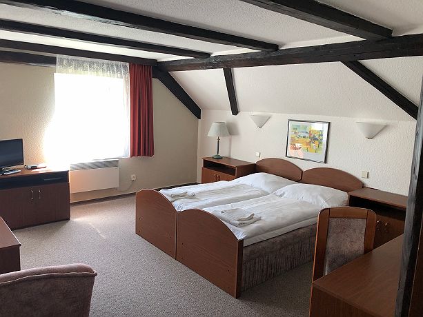 Apartment for up to 6 people. It is situated on the top floor with beautiful view to the garden. There is own bathroom with shower and toilette. There is a desk, fridge, TV with satellite and free WiFi in the apartment. During hot summer days you may use portable Air-Condition. There is common living room available on the ground floor with sitting, small kitchen and a terrace with a grill. You can use a coffee machine, minibar with offer of beverages (for additional fee) and additional kitchen equipment (kettle, cutlery, plates, glasses). You may play billiard and darts during your relax time.