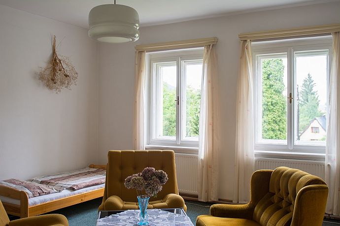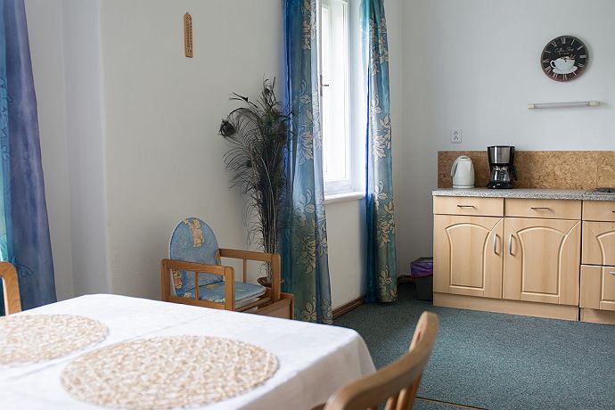 Apartmán Liběna se nachází na třetím nadzemním podlaží. Dispozice apartmánu odpovídají jednotce 2 + 1. V jedné místnosti se nachází kuchyň s jídelnou, v dalších dvou místnostech jsou ložnice. Z pokoje je příjemný výhled na zahradu. Apartmán se nachází v penzionu Signum Laudis. Dále jsou k dispozici tyto služby: sauna, koupací sud, koupací jezírko, gril, ping pong, zapůjčení kol, autodráha, kuželky, curling, dětské hřiště, kulečník, deskové hry, solná sloj, stolní fotbal, pitball.