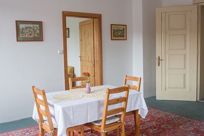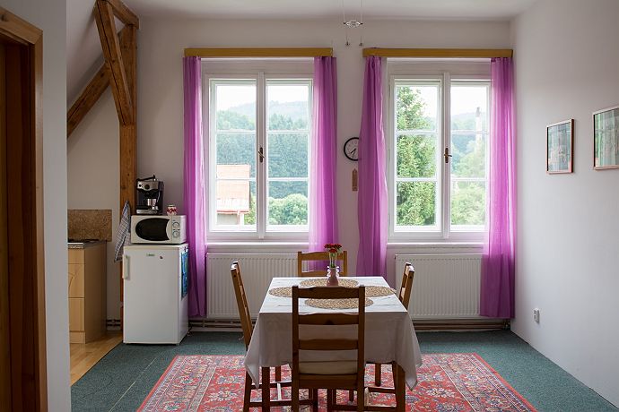 Apartmán Radmila se nachází na třetím nadzemním podlaží. Dispozice apartmánu odpovídají jednotce 2 + 1. V jedné místnosti se nachází kuchyň s jídelnou, v dalších dvou místnostech jsou ložnice. Z pokoje je příjemný výhled na zahradu. Apartmán se nachází v penzionu Signum Laudis. Dále jsou k dispozici tyto služby: sauna, koupací sud, koupací jezírko, gril, ping pong, zapůjčení kol, autodráha, kuželky, curling, dětské hřiště, kulečník, deskové hry, solná sloj, stolní fotbal, pitball.