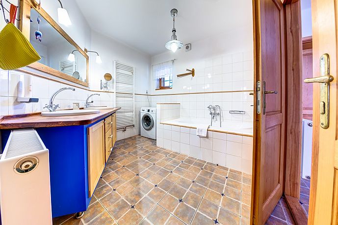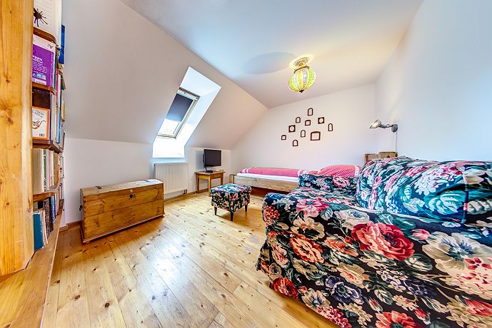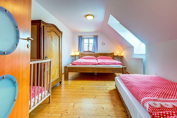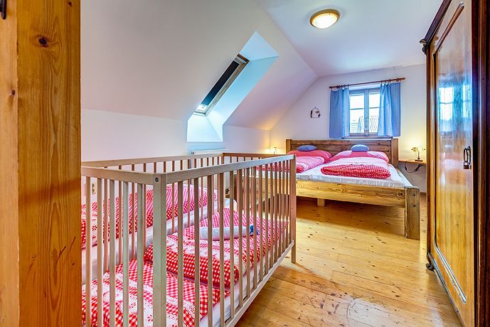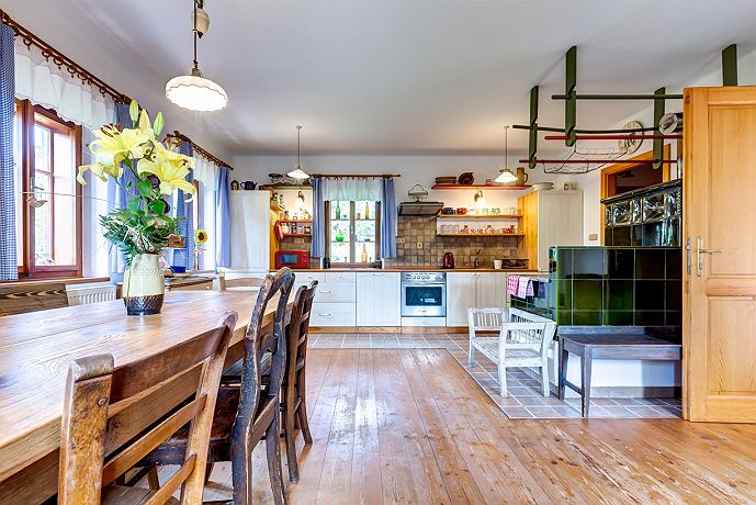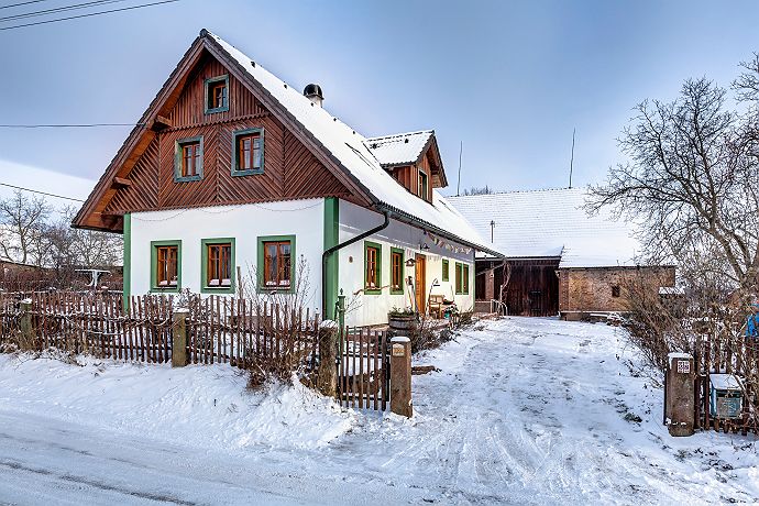 Chaloupka je laděna do tradičního venkovského stylu s prvky moderního ubytování s osmi místnostmi a dvěma koupelnami. Jsme baby friendly. V prvním podlaží se nachází světnice s kuchyní, kachlovými kamny a velkým dubovým stolem se sezením, dále ložnice s manželskou postelí s výhledem do zahrady. V prvním nadpodlaží naleznete společenskou místnost s TV, knihovnou, pohodlnou sedačkou a jednolůžkem. Na stejném podlaží je druhá ložnice se dvěma jednolůžky, třetí i čtvrtá ložnice s manželskou postelí a dětskými postýlkami s výhledem na cestu. V podkroví je dětská hernička plná hraček. Chaloupka má dvě koupelny - v přízemí s vanou a v prvním patře se sprchovým koutem. K dispozici pračka i sušička. Na půdě oplocené zahrady naleznete letitý kamenný stůl se sezením, ovocné stromy, vyžití pro děti (pískoviště, trampolínu, houpačky…), koupací sud až pro šest osob, tábořiště a gril. Stodolu, která v posledních letech přivítala pěknou řádku českých umělců, využijete k posezení nebo zábavě. I zde naleznete dětský koutek pro děti. V jiné části stodoly můžete vyzkoušet finskou saunu. Chaloupka se vytápí elektrokotlem s možností využití kachlových kamen. Až 3 přistýlky zdarma pro děti ve věku 0 - 15 let + 2 dětské postýlky zdarma pro děti ve věku 0 - 2 roky. Tzn. chaloupka se může naplnit maximálně do kapacity 9 osob + 3 děti (0 - 15 let) + 2 miminka (0 - 2 roky). Pro potvrzení rezervace je vyžadována zálohová platba 30 % z celé částky pobytu předem. Po obdržení zálohy bude pro Vás ubytování závazně rezervováno - možnost platby on-line platební bránou nebo bankovním převodem na bankovní účet Chaloupky pod Krakonošovem. Rezervace bez rizika pro rok 2020. „Staňte se součástí příběhu v Chaloupce pod Krakonošovem“ - Těšíme se na Vás!