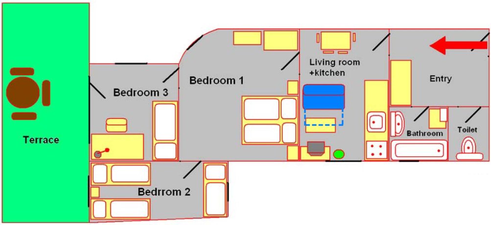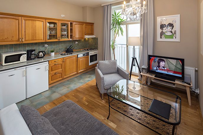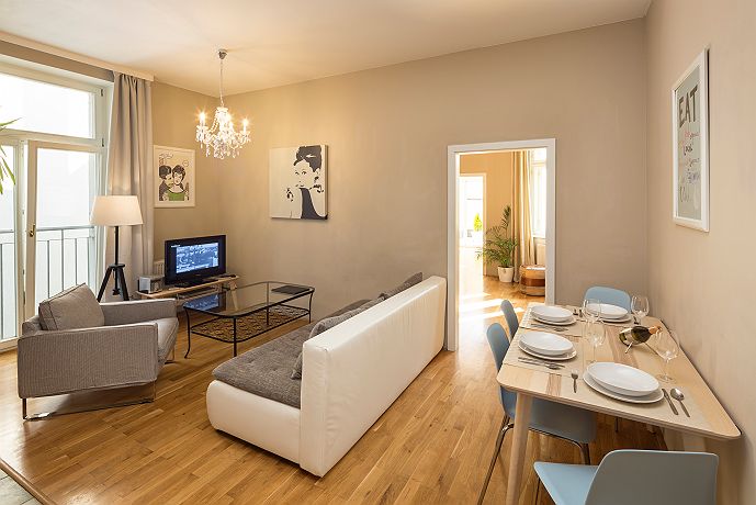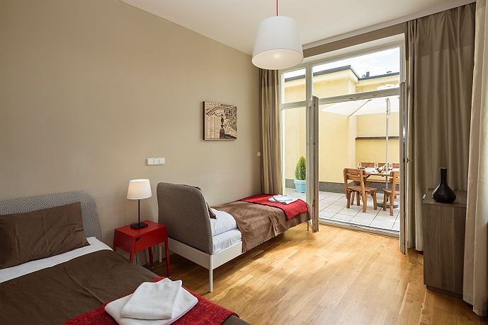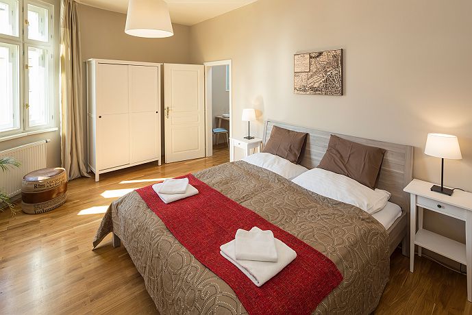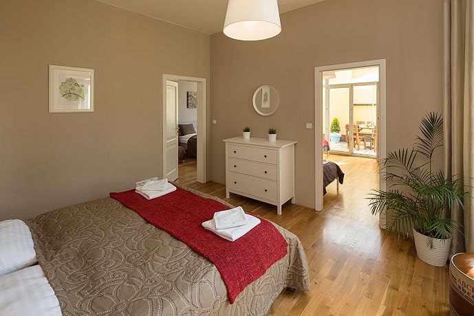 Large appartment situated in the historical building which is located directly on Wenceslas Square in Prague. Ideal for large groups, there are 3 bedrooms available + living room with kitchenette + terrace. It is possible to manage parking for your car while you stay in this appartment Prague Wenceslas Square. Internet WiFi is for free of charge, it is possible to ask for computer or mobile phone. We offer continental breakfast for only 6 EUR / person. There are a lot of restaurants, bars and shops in the near surroundings.