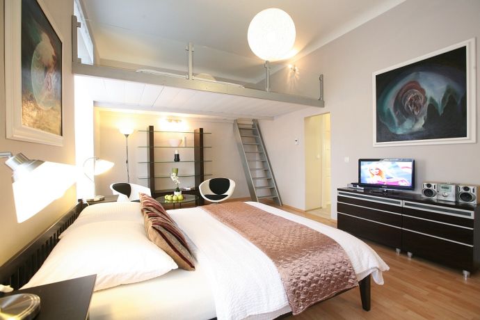 Apartment Karolina Svetla has an excellent location directly in the historical centre of Prague – Old Town , just 150 metres from the Charles Bridge and 350 metres from the Old Town Square. Despite the central location the street is quiet, but some small bars and restaurants with special atmosphere. A grocery is in the adjoining house. The apartment is composed of a large living room/bedroom, a kitchen, a bathroom with bath and toilet. The living room is equipped with a double bed on the wooden loft and there is a couch convertible to another two extra beds. TV, satellite and CD player in the living room, hardwood floors, nice views from the windows (in the winter there is a view of the Prague Castle). The kitchen is equipped with a gas kitchen range with electric oven, microwave oven, refrigerator, electric kettle, kitchen sink and other cooking equipment.