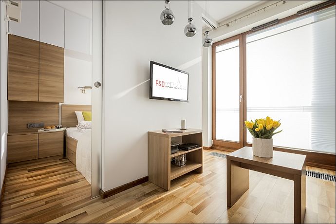 Modern studio apartment with air-conditioning, kitchenette and bedroom, located in the new housing estate „Mozaika Mokotów”, on the 3rd floor (a lift in the building). This completely furnished luxury apartment with stylish and tasteful furniture, appliances and fixtures is perfect for business stay. In the bedroom is a very comfortable double bed and sofabed for two persons in the living room. It has a parking space in the underground garage for guest’s disposal. This modern building is surrounded by green spaces with a carefully designed small architecture, playground and walking alleys, its located 150 meters from the nearest road, which significantly increases the comfort of living. Nearby are service centers, shops, offices, kindergartens, schools, the Shopping Center „Galeria Mokotów”, and a business center. Key pick up: 12 Miodowa Street from 4pm Arrival after 9pm only on the request and paid 30€ or 120 PLN Check out is until 11:00 am